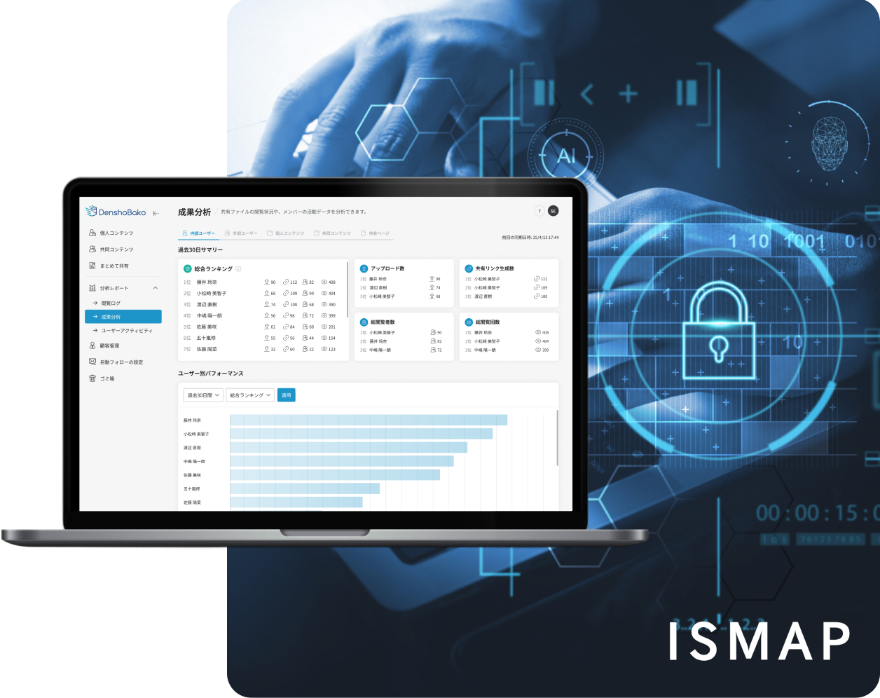 DenshoBako は日本政府が定めるセキュリティ評価制度「ISMAP」のサービスリストに登録されています。政府が定めるセキュリティ基準を満たしたサービスとして、公共団体での利用はもちろん、セキュリティを重視する民間企業・団体でも活用いただくことができます。