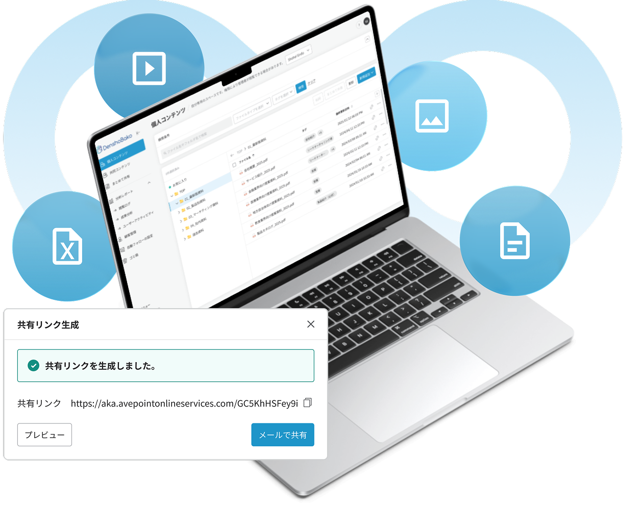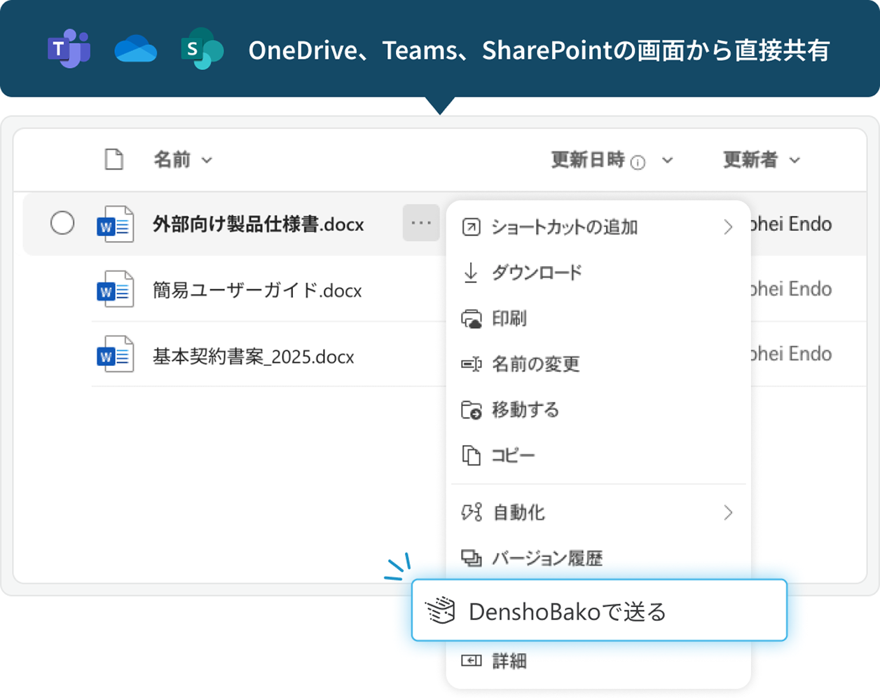 外部共有を無効にした環境でも、操作感を損なうことなく、安全にファイルを送信可能。OneDrive、Teams、SharePoint上のファイルを、直感的な操作でそのまま共有できます。セキュリティと利便性、どちらも妥協しない共有体験を実現します。