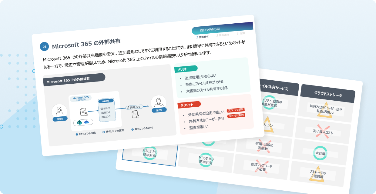ファイル共有ツールやクラウドストレージツールなど脱PPAPの方法を比較検討し、組織のニーズに合った脱PPAPの方法を説明しています。